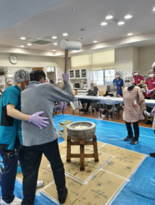 患者様はセラピストと共に杵で餅をついたり、テーブル上で餅を丸めたりして参加し、最後にはつきたての餅を食べていただきました。