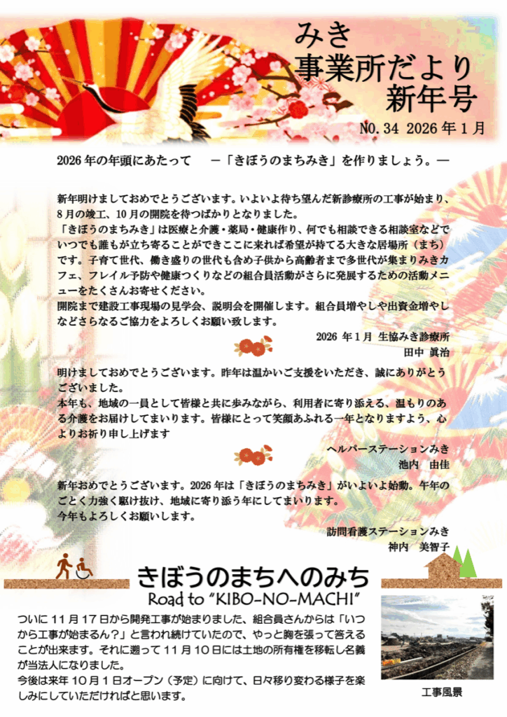2026 年の年頭にあたって -「きぼうのまちみき」を作りましょう。― 新年明けましておめでとうございます。 いよいよ待ち望んだ新診療所の工事が始まり、8 月の竣工、10 月の開院を待つばかりとなりました。