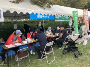 にぎやかな祭りの雰囲気の中で、地域のみなさんと一緒に“元気チェック”。
