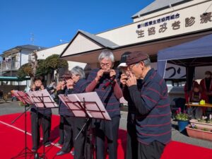 近隣の氷上こども園の演奏や田中支部の演舞、平井支部のアンパンマンショーが場を華やかにしてくれました。白山支部のめだかの学校、志度教室のハーモニカ演奏をされた皆さんから、「楽しかった。次回も出演させてほしい」との嬉しい悲鳴が聞こえ、何より沢山の笑顔をいただいたことが診療所建設運動の励みとなります。